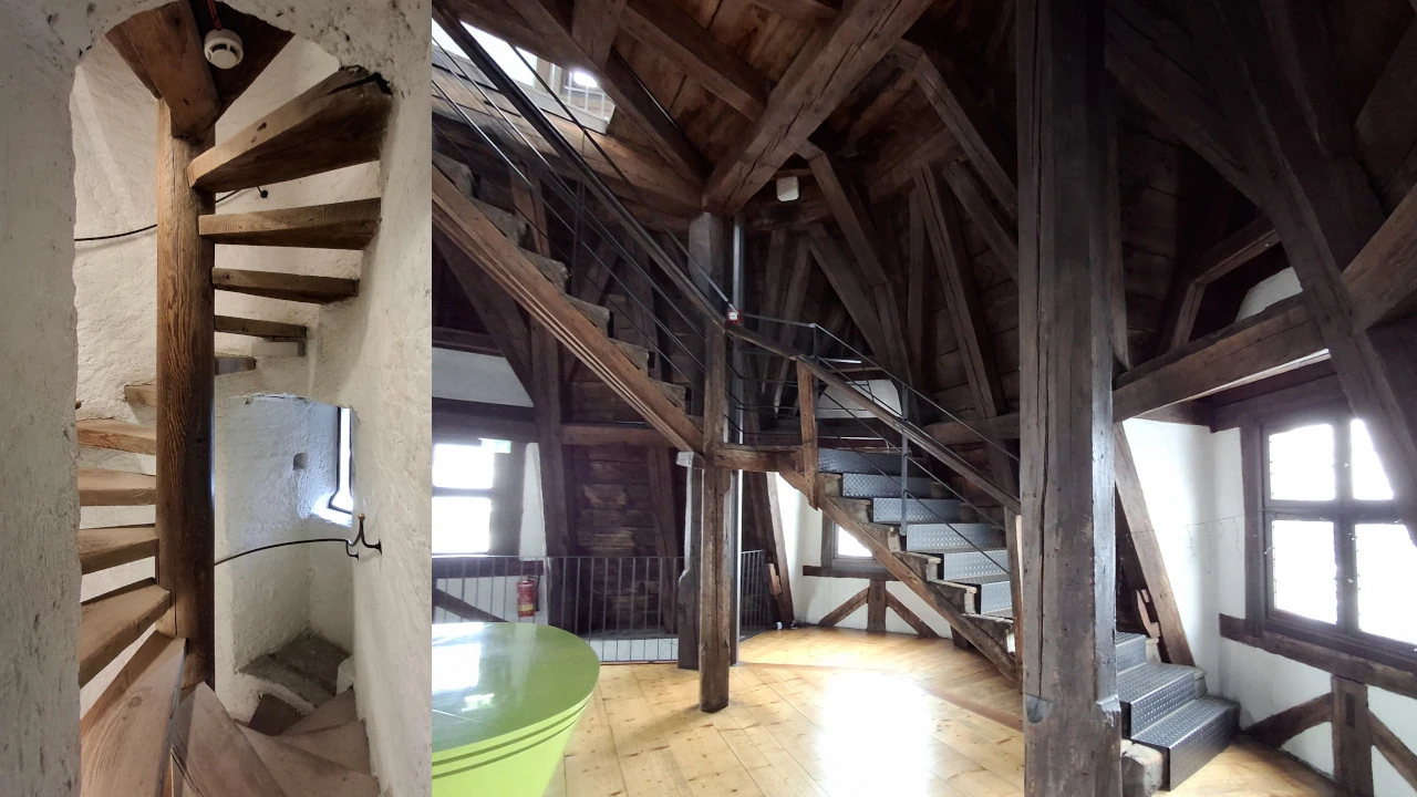 Zum Abschluss kann noch der Münzerturm bestiegen werden - über die enge alte Wendeltreppe, oder nicht so schwindelerregend über die neue Treppe zu den verschiedenen Ebenen des Turms. Ganz oben wird man mit einem herrlichen Panoramablick belohnt.
